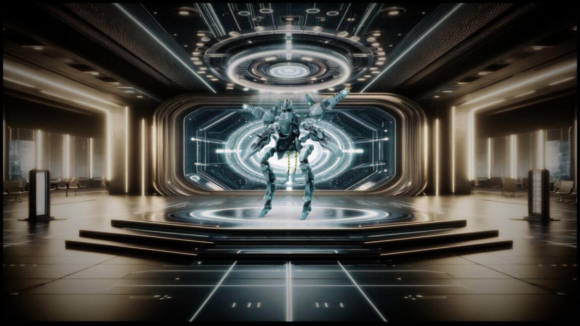 Conceptual jet pack mech Suit. in sci fi environment background.