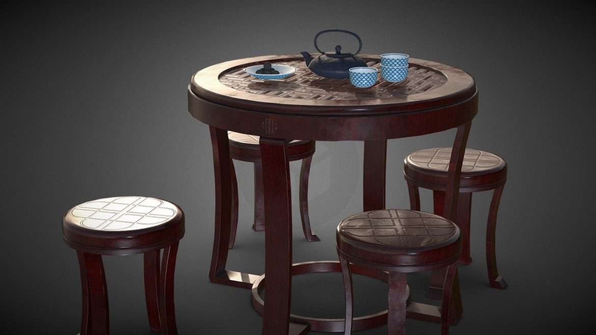 Chinese style tea table set. high to low poly modeling and UV’s in Blender, texturing in Substance Painter.Contains :-1Table/ 1glass top/ 1wood decoration (8 stacked alpha planes)/ -1Stool (4 instances)/ -1Iron cast teapot/ -1Tea cup (3 instances)/ -1Plate/ -1Tea ball (6 instances)